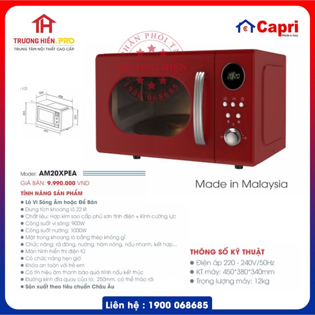 Vỏ ngoài của Lò vi sóng Capri được làm từ hợp kim cao cấp phủ sơn tĩnh điện với cửa lò làm từ kính cường lực siêu bền, có đèn chiếu sáng trong lò tiện cho việc quan sát thực phẩm. Mặt trong khoang lò được làm bằng thép không gỉ, dễ lau chùi vệ sinh.