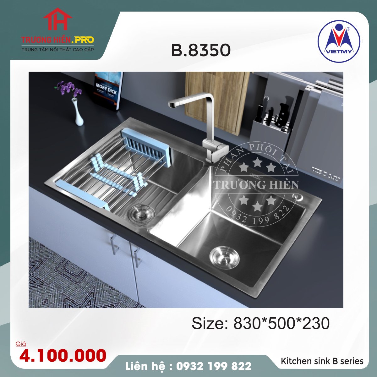 Chậu rửa chén inox B.8350 là dòng sản phẩm chậu chất lượng cao thuộc series B của Việt Mỹ được sản xuất từ inox cao cấp. Dòng chậu inox Việt Mỹ có mẫu mã hiện đại, sang trọng phù hợp với nhiều không gian phòng bếp. Sản phẩm được làm từ inox 304 cao cấp nên có độ bền cao, dễ dàng lau chùi, không bị hoen ố và trầy xước theo thời gian. Chính vì vậy, các các sản phẩm của chậu chén inox 304 Việt Mỹ được người tiêu dùng yêu thích và lựa chọn cả về mẫu mã và chất lượng.