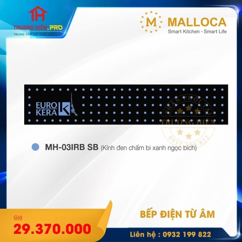 Bếp Điện Từ Malloca MH-03IRB SB được thiết kế tinh tế và hiện đại phù hợp với mọi không gian bếp trong gia đình. Bếp điện từ Malloca MH03IRB SB được thiết kế với mặt kính âm 1 điện, 2 từ. Mặt kính Eurokera màu đen chấm bi xanh ngọc bích sáng bóng mang sự sang trọng và dễ dàng vệ sinh sau khi nấu nướng. Bếp được điều khiển bằng cảm ứng tiện dụng, nhận diện ngay cả khi tay đang ướt với màn hình hiển thị LED.