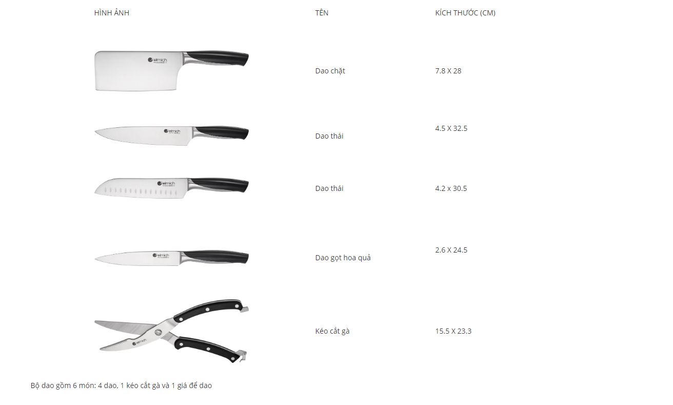 Bộ dao gồm 6 món: 4 dao, 1 kéo cắt gà và 1 giá để dao