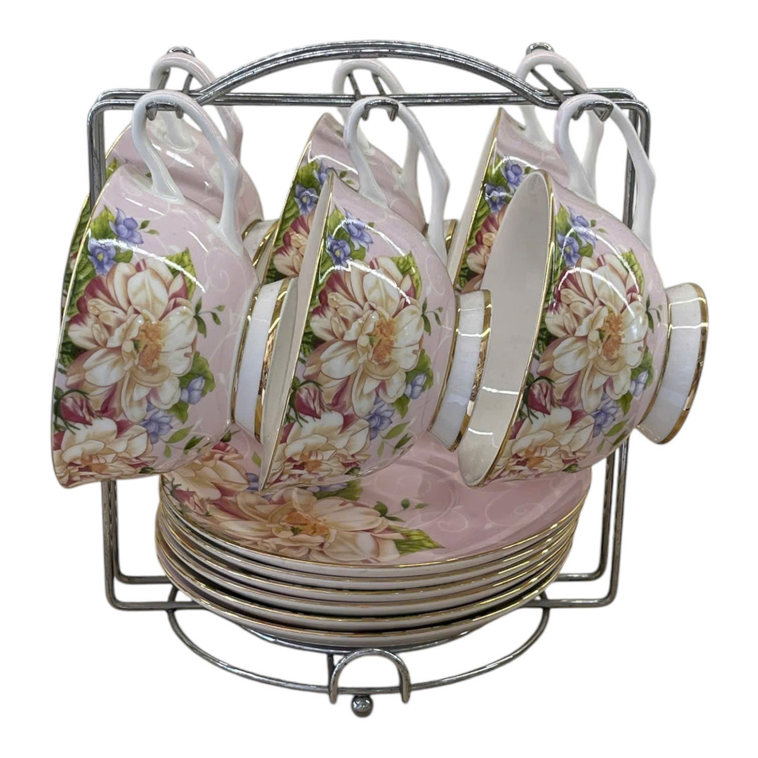 Bộ sản phẩm đầy đủ: Bao gồm ấm trà, tách trà, đĩa đựng và giá treo, tiện lợi cho việc sử dụng và bảo quản.