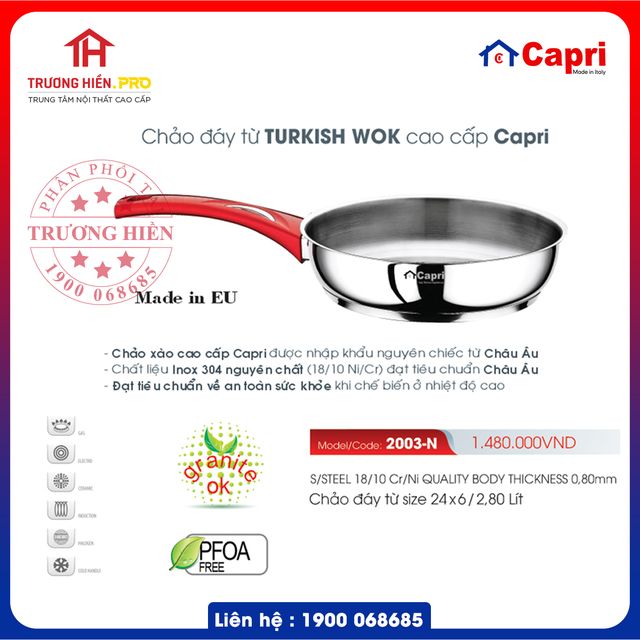 - Chảo đáy từ TUKISK WOK cao cấp Capri 2003-N được sản xuất trực tiếp tại châu Âu với chất liệu Inox 304 nguyên chất (18/10 Ni/Cr), với thiết kế nổi trội tạo nên một sản phẩm hoàn hảo mang đến sự hài lòng và an tâm khi sử dụng.