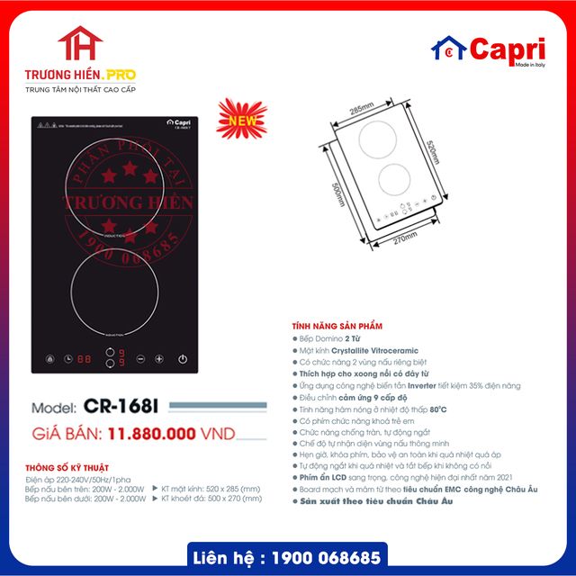 Bếp từ domino Capri CR-168I vẫn được trang bị công nghệ tiên tiến nhất cho tất cả các dòng bếp từ, dưới sự giám sát nghiêm ngặt của Capri theo tiêu chuẩn Châu Âu: