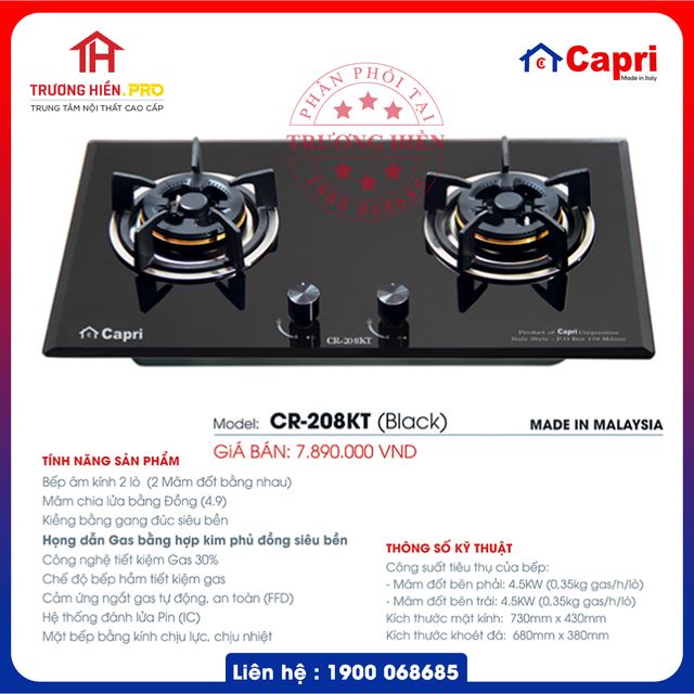 Bếp gas âm Capri CR-208KT Black thiết kế hiện đại, là sản phẩm bếp gas âm 2 lò mới của Capri, được tích hợp công nghệ hiện đại với các tính năng hiện đại như sau: