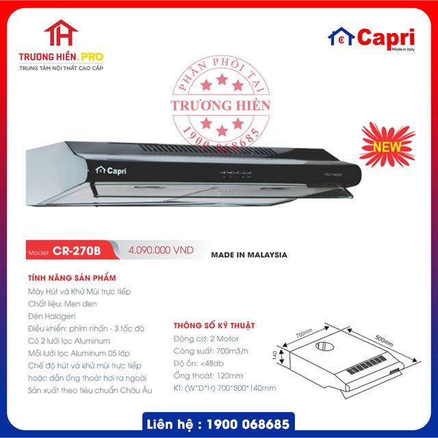 Máy hút mùi cổ điển Capri CR-270B thiết kế đơn giản nhưng sang trọng, là sản phẩm máy hút mùi cổ điển mới của Capri, được tích hợp công nghệ tiên tiến với các thông số kỹ thuật như sau: