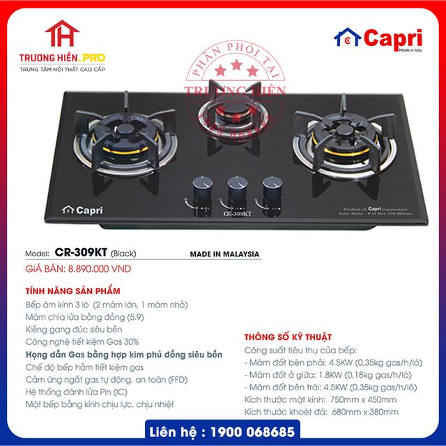 Bếp gas Capri CR-309KT Black thiết kế hiện đại, là sản phẩm bếp âm 3 lò mới của Capri, được tích hợp công nghệ hiện đại với các tính năng hiện đại như sau: