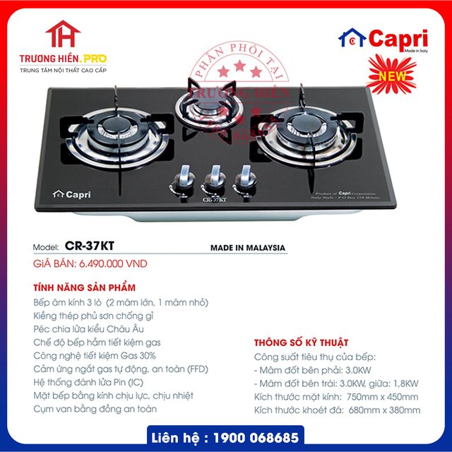 Bếp gas âm Capri CR-37KT thiết kế hiện đại, là sản phẩm bếp gas âm 3 lò mới của Capri, được tích hợp công nghệ hiện đại với các tính năng hiện đại như sau: