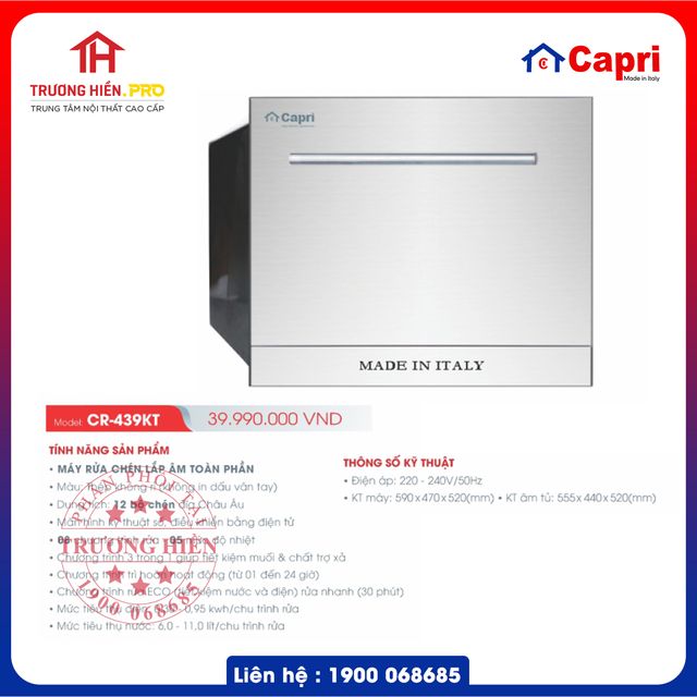 Máy rửa chén âm tủ Capri CR-439KT thiết kế hiện đại, là sản phẩm máy rửa chén mới của thương hiệu Capri, được tích hợp công nghệ hiện đại có xuất xứ thương hiệu từ Italy không có sản phẩm nhái hay tương tự trên thị trường Việt Nam: