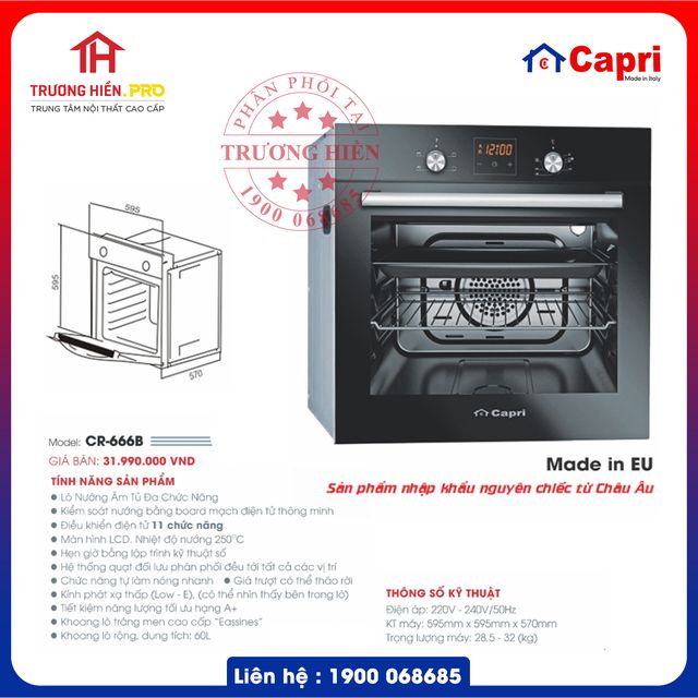 Lò nướng âm tủ Capri CR-666B được thiết kế âm tủ sang trọng với các tính năng vượt trội như sau: