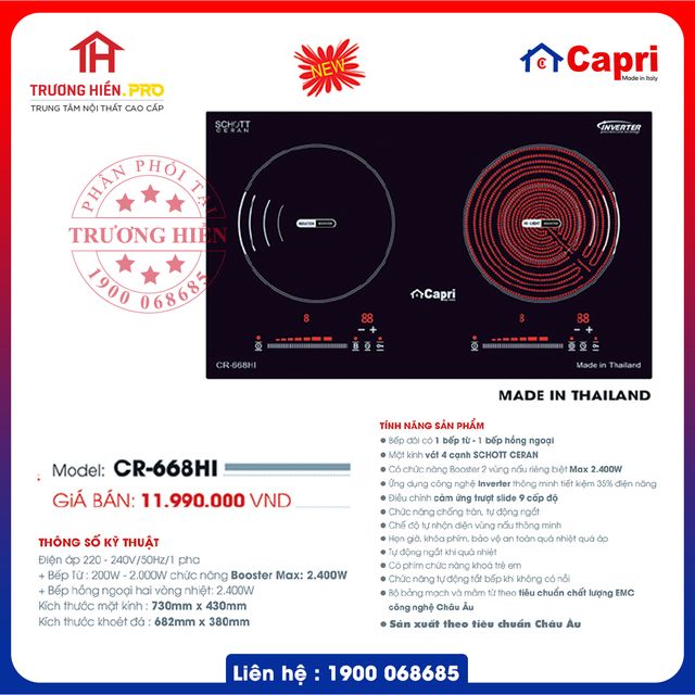 Thiết bị nhà bếp Capri CR-668HI thuộc dòng bếp từ - hồng ngoại 2 vùng nấu, là sản phẩm cao cấp của Capri - thương hiệu xuất xứ từ Italy, bếp được trang bị những tính năng vượt trội như sau: