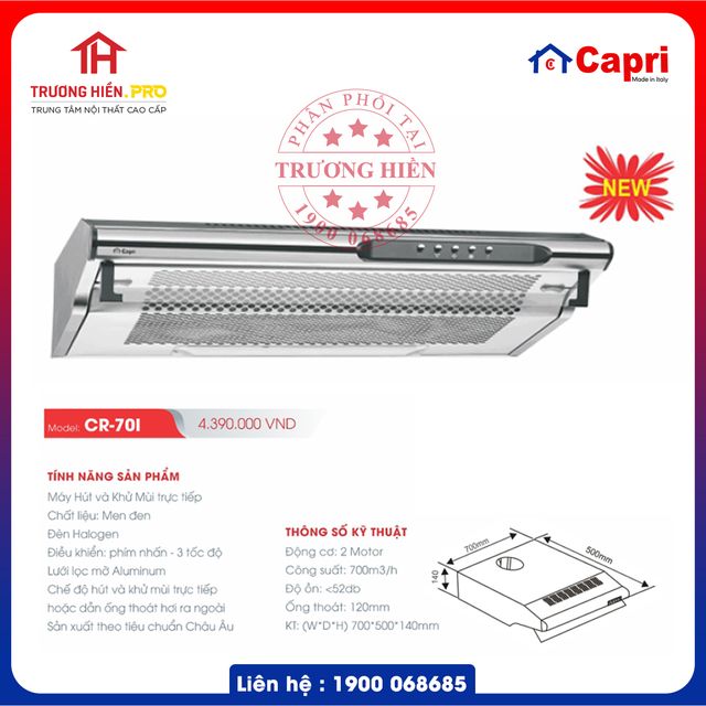 Máy hút mùi cổ điển Capri CR-70I thiết kế đơn giản nhưng sang trọng, là sản phẩm máy hút mùi cổ điển mới của Capri, được tích hợp công nghệ tiên tiến với tính năng:
