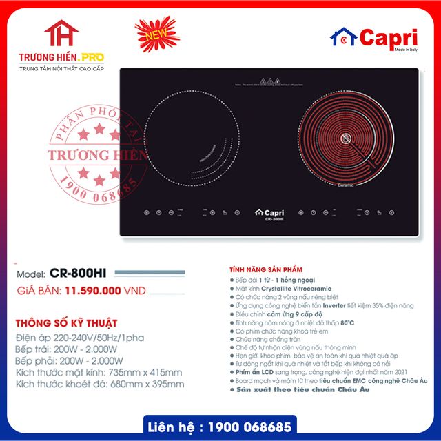 Bếp điện từ hồng ngoại đôi Capri CR-800HI thuộc dòng bếp điện âm 2 vùng nấu, là sản phẩm cao cấp của Capri - thương hiệu xuất xứ từ Italy, bếp được trang bị những tính năng vươt trội như sau: