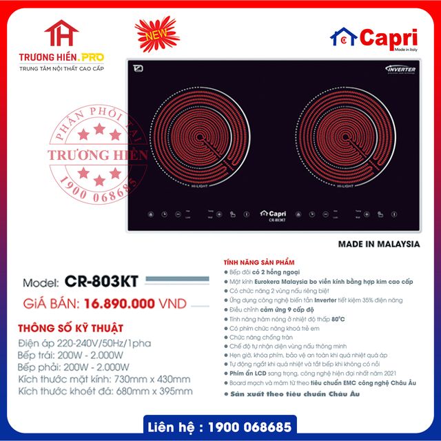 Bếp điện hồng ngoại Capri CR-803KT thuộc dòng bếp hồng ngoại 2 vùng nấu, là sản phẩm cao cấp của Capri- thương hiệu xuất xứ từ Italy, bếp được trang bị những tính năng vươt trội như sau: