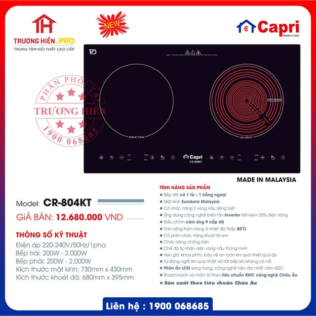 Bếp điện từ hồng ngoại đôi Capri CR-804KT thuộc dòng bếp từ - hồng ngoại 2 vùng nấu, là sản phẩm cao cấp của Capri - thương hiệu xuất xứ từ Italy, bếp được trang bị những tính năng vươt trội với thông số kỹ thuật như sau: