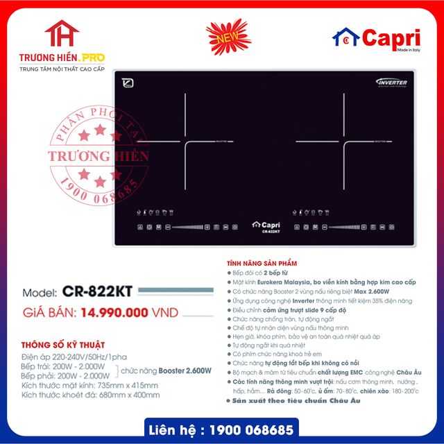 Bếp điện từ đôi Capri CR-822KT thuộc dòng bếp từ đôi 2 vùng nấu, là sản phẩm cao cấp của Capri - thương hiệu xuất xứ từ Italy, bếp được trang bị những tính năng vươt trội như sau: