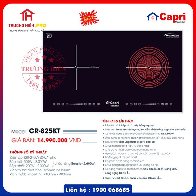 Bếp điện từ - hồng ngoại đôi Capri CR-825KT thuộc dòng bếp điện đôi 2 vùng nấu, là sản phẩm cao cấp của Capri - thương hiệu xuất xứ từ Italy, bếp được trang bị những tính năng vươt trội như sau: