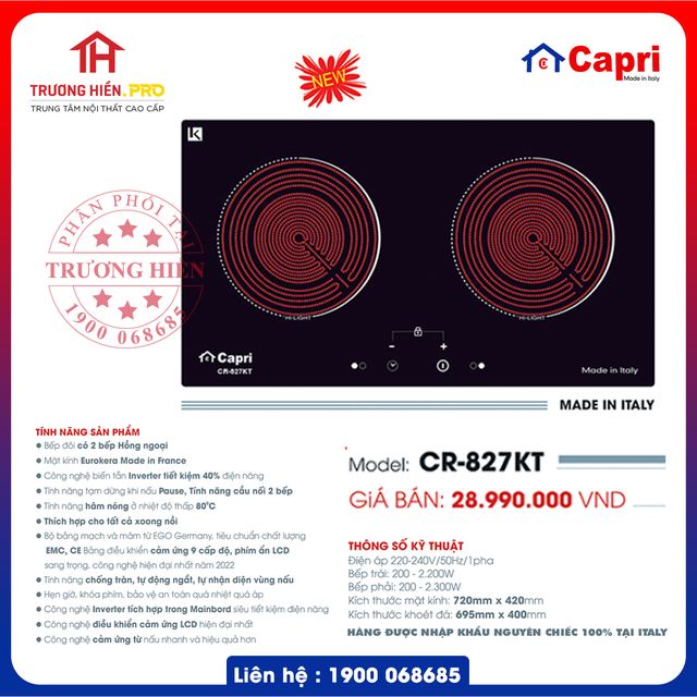 Bếp điện hồng ngoại Capri CR-827KT thuộc dòng bếp hồng ngoại 2 vùng nấu, là sản phẩm cao cấp của Capri - thương hiệu xuất xứ từ Italy, bếp được trang bị những tính năng vươt trội như sau: