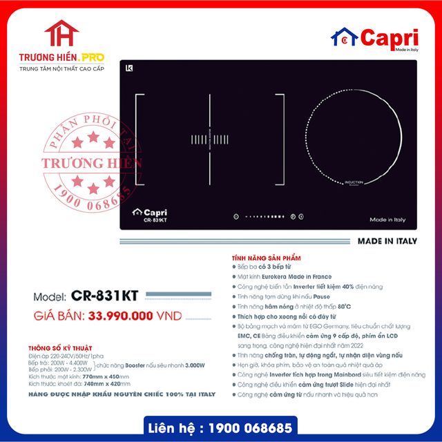 Bếp điện từ đa điểm Capri CR-831KT thuộc dòng bếp điện từ 3 vùng nấu, là sản phẩm cao cấp của Capri - thương hiệu xuất xứ từ Italy, bếp được trang bị những tính năng vươt trội như sau: