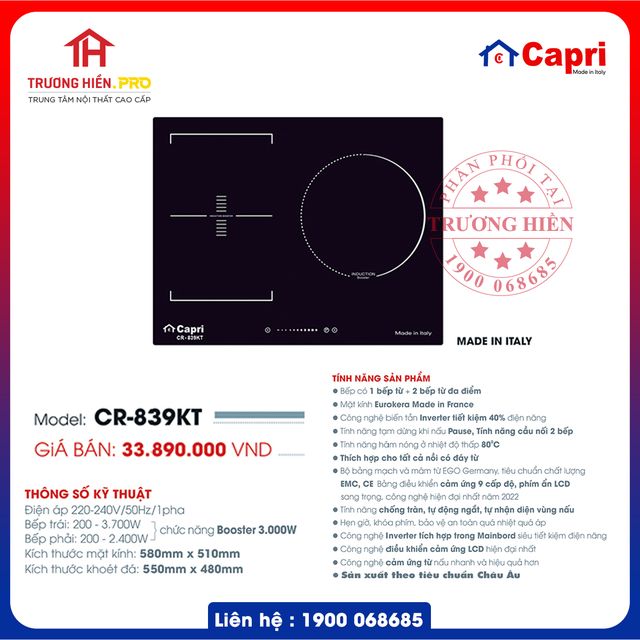 Bếp từ nhập khẩu Capri CR-839KT thuộc dòng bếp điện 3 vùng nấu, là sản phẩm cao cấp của Capri - thương hiệu xuất xứ từ Italy, bếp được trang bị những tính năng vươt trội như sau: