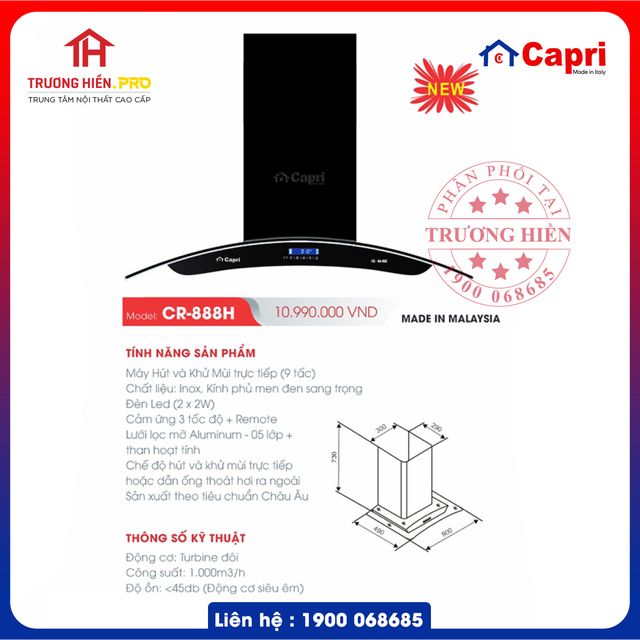 Máy hút mùi Capri CR-888H thiết kế sang trọng, là sản phẩm máy hút và khử mùi hiện đại mới của Capri, được tích hợp công nghệ tiên tiến với các tính năng như sau: