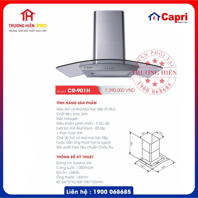 Máy hút mùi Capri CR-901H thiết kế sang trọng, là sản phẩm máy hút và khử mùi hiện đại mới của Capri, được tích hợp công nghệ tiên tiến với các tính năng sau: