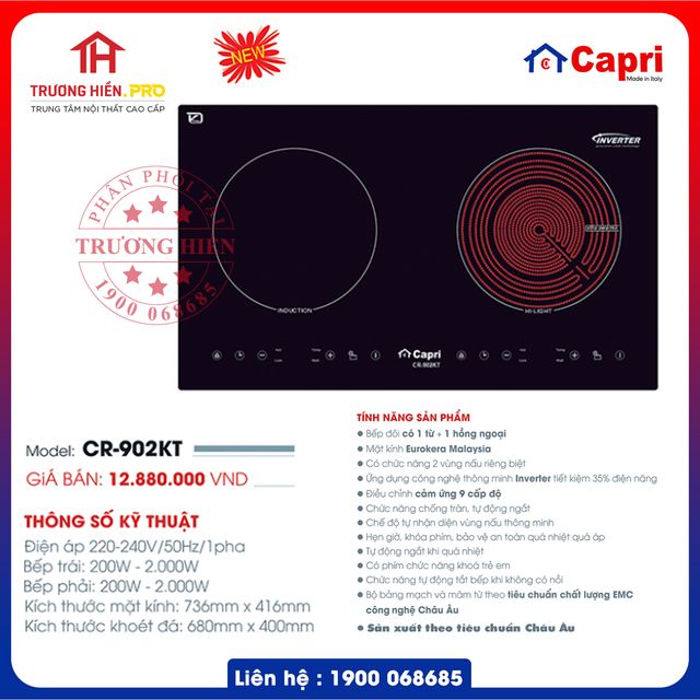 Bếp điện đôi Capri CR-902KT thuộc dòng bếp điện âm 2 vùng nấu, là sản phẩm cao cấp của Capri - thương hiệu xuất xứ từ Italy, bếp được trang bị những tính năng vươt trội như sau: