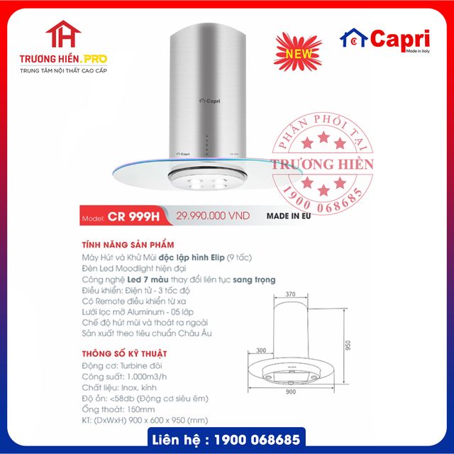 Máy hút mùi Capri CR-999H thiết kế sang trọng, là sản phẩm máy hút mùi độc lập mới của Capri, được tích hợp công nghệ tiên tiến với các tính năng như sau: