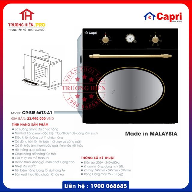 Capri CR-BIE 66T3-A1đến từ thương hiệu của Italy, sản xuất theo tiêu chuẩn Châu Âu giúp người dùng yên tâm về chất lượng sản phẩm. Lò nướng âm tủ có nhiều ưu điểm và có dung tích lớn 59 lít sẽ đáp ứng nhu cầu nướng khối lượng lớn thịt cá, rau củ, bánh ngọt, gà/vịt nguyên con.