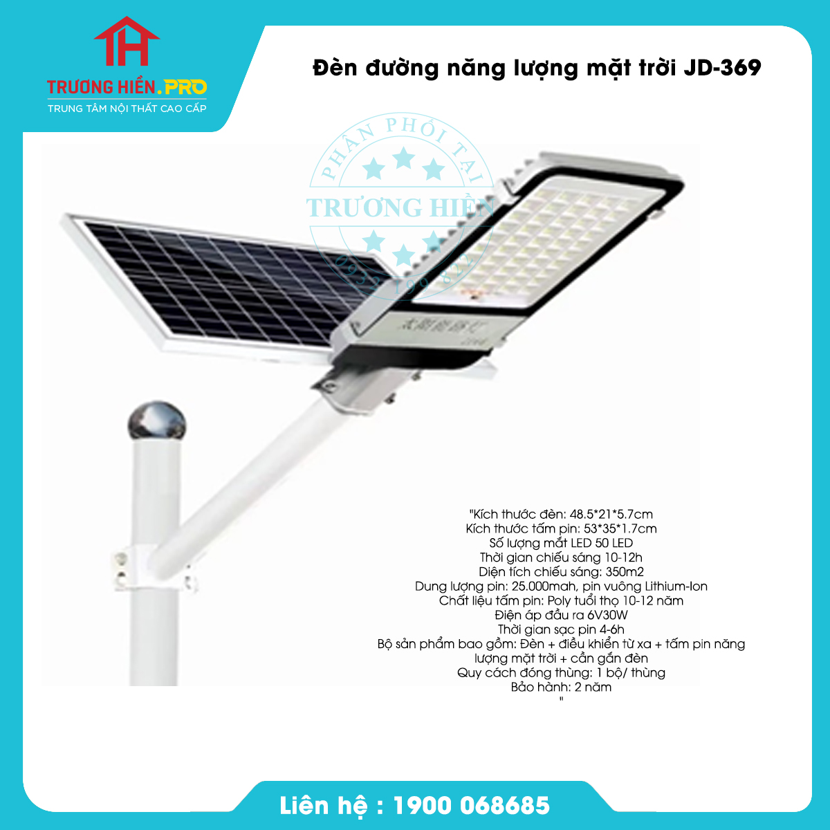 Đèn JD-369 được trang bị 50 Chip LED SMD 5730 cao cấp, siêu sáng với khả năng chiếu sáng vượt trội, dải ánh sáng trắng 6500K gần giống với ánh sáng ban ngày. Đèn có công suất cao 300W ánh sáng phủ rộng và xa, cung cấp đủ ánh sáng cho những nơi có diện tích lên đến 350m2. Phúc Tín Solar cam kết sản phẩm đèn JD369 có thể chiếu sáng xuyên đêm lên đến 14 tiếng/ngày.