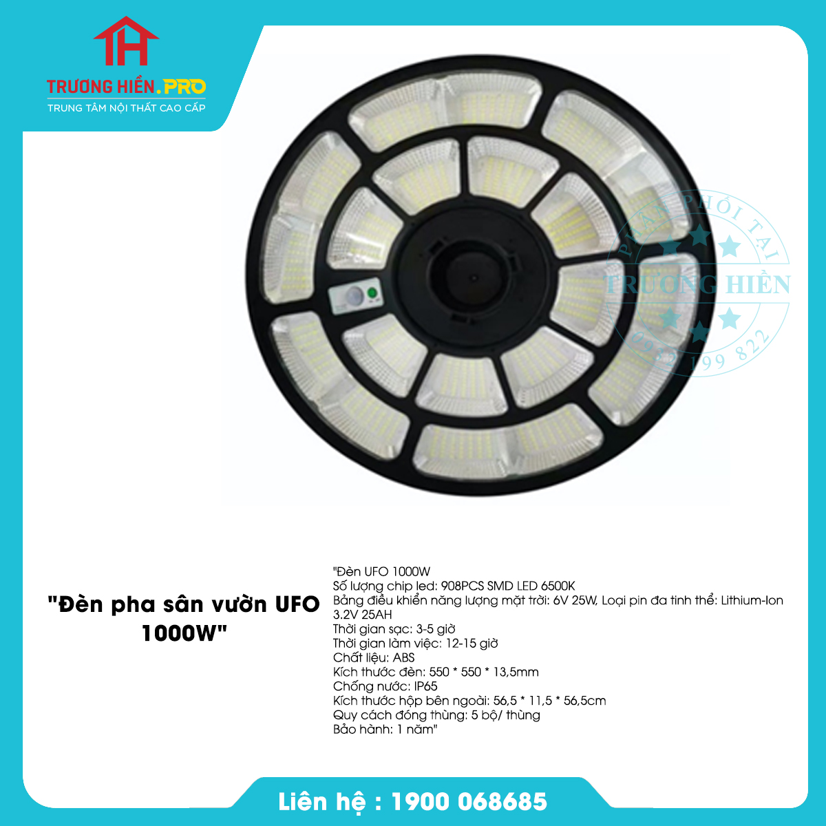 Đèn năng lượng mặt trời UFO 1000W hay còn gọi là đèn năng lượng mặt trời đĩa bay là dòng sản phẩm chuyên dùng trong các dự án lắp đặt đèn ở công viên, sân vườn, chung cư, bệnh viện... Sản phẩm được đánh giá rất cao về độ bền, khả năng chống bụi, chống nước và thời gian sử dụng.