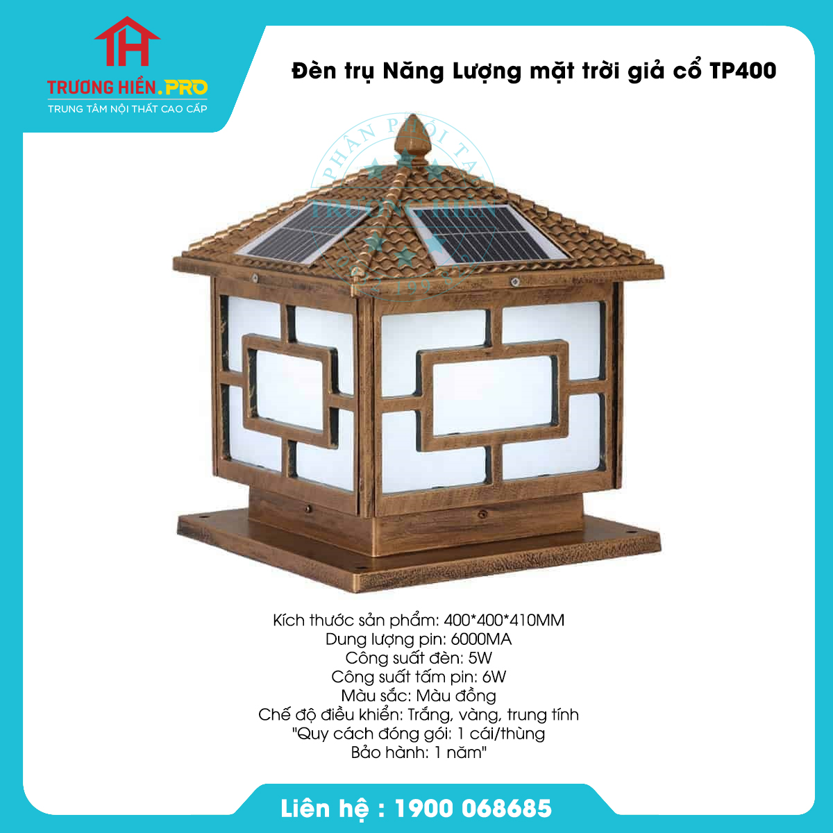 Đèn trụ cổng năng lượng mặt trời được cấu tạo bằng hợp kim sơn màu đen và mạ đồng rất đẹp mắt, chống gỉ sét, có hình dạng độc đáo, cổ kính. Đèn có thể lắp tại nhiều vị trí khác nhau giúp tôn vinh vẻ đẹp quyến rũ cho ngôi nhà.