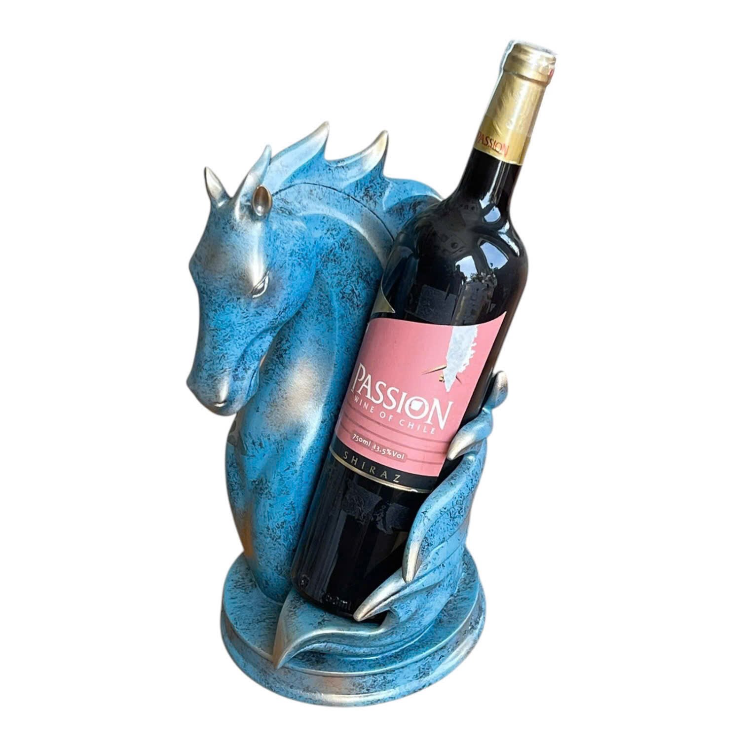 Thiết kế độc đáo, đậm chất nghệ thuật: Kệ rượu được thiết kế theo hình đầu ngựa, kết hợp tone màu xanh mới lạ, tạo nên vẻ đẹp cá tính và hiện đại.