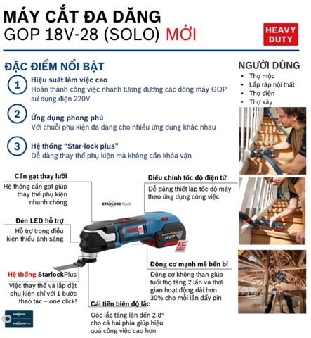 Máy cắt đa năng Bosch GOP 18V-28 chuyên nghiệp chất lượng cao mới nhất của hãng mang tới các giải pháp lý tưởng để thúc đẩy tiến trình công việc, giúp tiết kiệm tối đa thời gian và công sức của người lao động. Xử lý linh hoạt và hiệu quả trong mọi tình huống với thiết kế thông minh cùng hệ thống kết nối phụ kiện tiện lợi cho phép thực hiện đồng thời nhiều mục đích ứng dụng khác nhau. Sẵn sàng đương đầu với bất kỳ thử thách và nhiệm vụ khó khăn nhất nhờ các công nghệ nổi bật và hàng loạt các cải tiến vượt trội, Bosch GOP 18V-28 tạo ra các kết quả làm việc tích cực trong thời gian ngắn.