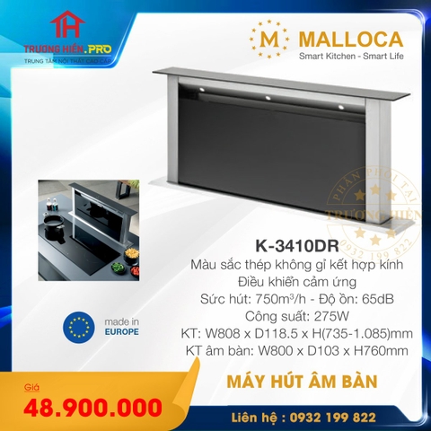 Máy hút mùi âm bàn Malloca K-3410DR được sản xuất bởi thương hiệu Malloca nổi tiếng, là dòng máy hút khòi khử mùi âm tủ với ưu điểm là phần thân máy và động cơ đặt âm bên trong tủ nên sau khi lắp đặt trong rất gọn gàng và không chiếm diện tích không gian bếp của gia đình bạn