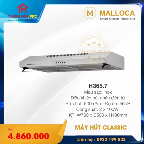 Malloca là thương hiệu thiết bị nhà bếp nổi tiếng thuộc sở hữu bởi Việt Nam, được đăng ký bản quyền tại Tây Ban Nha. Các dòng sản phẩm máy hút khử mùi của Malloca nói chung cũng như sản phẩm máy hút khử mùi classic H365-7 nói riêng đều được người tiêu dùng công nhận về hiệu quả khử mùi và độ bền cao, phong cách thiết kế tinh tế, mang đậm nét đặc trưng của châu Âu.