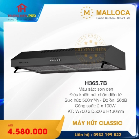 Malloca là thương hiệu thiết bị nhà bếp nổi tiếng thuộc sở hữu bởi Việt Nam, được đăng ký bản quyền tại Tây Ban Nha. Các dòng sản phẩm máy hút khử mùi của Malloca nói chung cũng như sản phẩm máy hút khử mùi classic H365-7B nói riêng đều được người tiêu dùng công nhận về hiệu quả khử mùi và độ bền cao, phong cách thiết kế tinh tế, mang đậm nét đặc trưng của châu Âu.