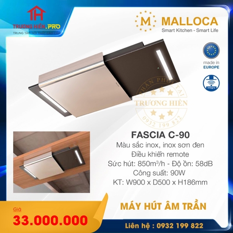Máy hút mùi âm trần Malloca FASCIA C-90 được sản xuất bởi thương hiệu Malloca nổi tiếng, là dòng máy hút khòi khử mùi âm tủ với ưu điểm là phần thân máy và động cơ đặt âm bên trong tủ nên sau khi lắp đặt trong rất gọn gàng và không chiếm diện tích không gian bếp của gia đình bạn.