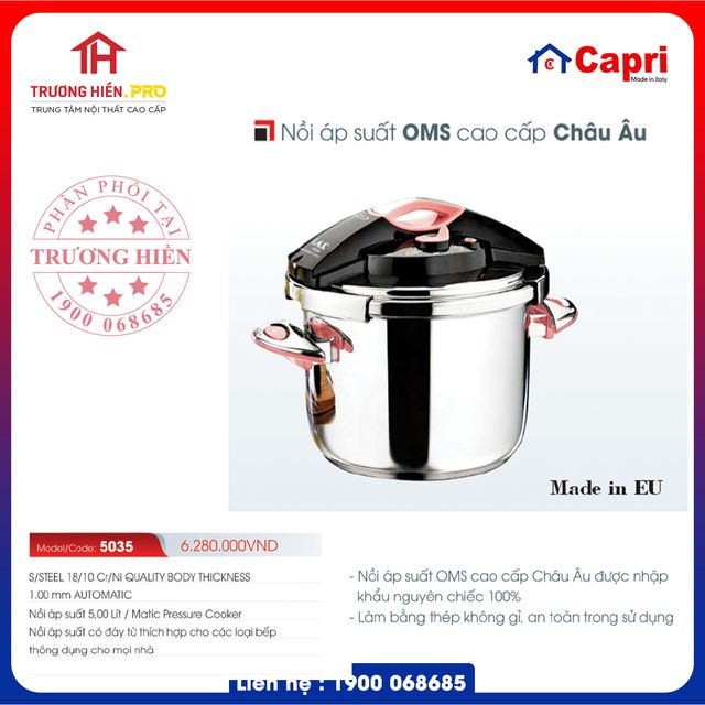 - Nồi áp suất cao cấp OMS 5035 5 Lít không sử dụng điện có khả năng nấu nhanh, giữ nhiệt tốt, là dụng cụ nhà bếp cần thiết trong mỗi gia đình, được sản xuất trên dây chuyền công nghệ hiện đại của châu Âu, đảm bảo tiêu chuẩn về độ bền, an toàn.