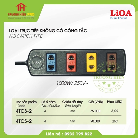 Ổ CẮM LIOA 4 LỖ 2 CHẤU 3M 1000W KHÔNG CÓ CÔNG TẮC MODEL 4TC3-2
