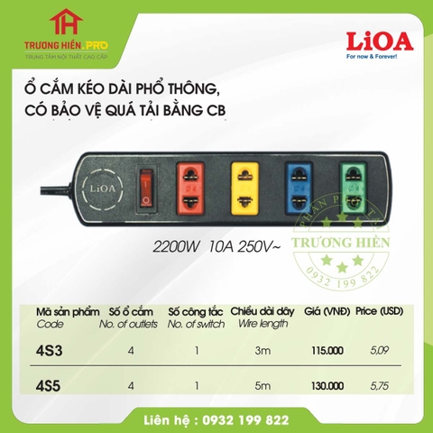 Ổ CẮM LIOA 4 LỖ 2 CHẤU 3M 10A 2000W - 2200W MODEL 4S3