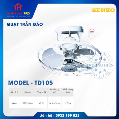 Quạt đảo trần Senko TD105 thuộc dòng quạt đảo trần của thương hiệu Senko nổi tiếng Việt Nam. Chiếc quạt này có thiết kế gắn trần nhà như quạt trần thông thường, nhưng có khả năng điều khiển hướng xoay đảo 360 độ, nhờ đó luồng gió có thể lan tỏa khắp mọi ngóc ngách trong ngôi nhà một cách nhanh chóng. Vì thế, quạt Senko TD105 đang được rất nhiều người tin dùng.