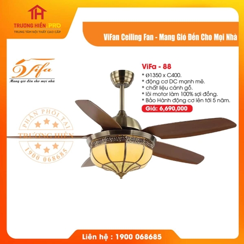 Quạt đèn VIFA hay còn gọi là quạt trần trang trí hiện là sản phẩm đang được khá nhiều gia đình Việt ưa thích và lựa chọn sử dụng. Cánh quạt được làm từ chất liệu cao cấp như gỗ, kim loại... cùng động cơ được sản xuất theo công nghệ mới nhất. Nhờ đó quạt luôn vận hành êm ái, tạo lưu lượng gió nhiều mà không hề gây tiếng ồn.