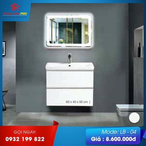 Bộ tủ chậu LB-04 có thiết kế hiện đại, thanh lịch với tông màu trắng làm chủ đạo. Mẫu tủ chậu này cũng gồm 3 bộ phận chính là gương soi, tủ đựng đồ, chậu rửa mặt. Bên ngoài chậu rửa mặt được viền lên cao giúp nước không bị bắn ra ngoài trong quá trình sử dụng. Tủ đựng đồ có diện tích rộng rãi có thể đựng nhiều đồ dùng tiện lợi, gọn hàng.