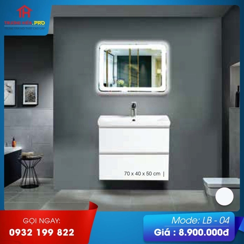 Bộ tủ chậu LB-04 có thiết kế hiện đại, thanh lịch với tông màu trắng làm chủ đạo. Mẫu tủ chậu này cũng gồm 3 bộ phận chính là gương soi, tủ đựng đồ, chậu rửa mặt. Bên ngoài chậu rửa mặt được viền lên cao giúp nước không bị bắn ra ngoài trong quá trình sử dụng. Tủ đựng đồ có diện tích rộng rãi có thể đựng nhiều đồ dùng tiện lợi, gọn hàng.