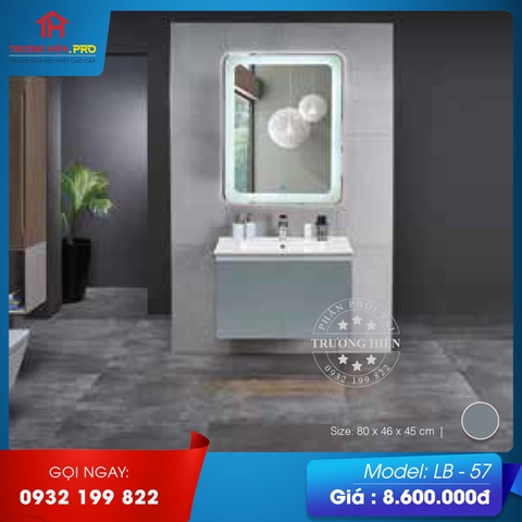 Bộ tủ chậu LB-57 có thiết kế hiện đại, thanh lịch với tông màu xám nhạt làm chủ đạo. Mẫu tủ chậu này cũng gồm 3 bộ phận chính là gương soi, tủ đựng đồ, chậu rửa mặt. Bên ngoài chậu rửa mặt được viền lên cao giúp nước không bị bắn ra ngoài trong quá trình sử dụng. Tủ đựng đồ có diện tích rộng rãi có thể đựng nhiều đồ dùng tiện lợi, gọn hàng.