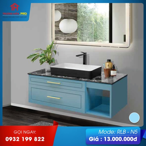 Bộ tủ chậu RLB-N5 có thiết kế hiện đại, thanh lịch với tông màu xanh dương nhạt làm chủ đạo. Mẫu tủ chậu này cũng gồm 3 bộ phận chính là gương soi, tủ đựng đồ, chậu rửa mặt. Bên ngoài chậu rửa mặt được viền lên cao giúp nước không bị bắn ra ngoài trong quá trình sử dụng. Tủ đựng đồ có diện tích rộng rãi có thể đựng nhiều đồ dùng tiện lợi, gọn hàng.